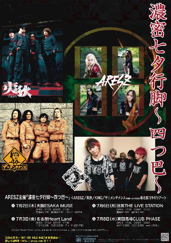 × [PR]上記の広告は3ヶ月以上新規記事投稿のないブログに表示されています。新しい記事を書く事で広告が消えます。 ARESZ主催『濃密七夕行脚~四つ巴~』 Open 17:00 / Start 17:30 前売り¥3,000(+1d) / 当日¥3,500(+1d) 《チケット発売》 先行販売期間:2015年4月9日(木)~4月14日(火) 6日間限定でADDAMA通販のみ 詳細はコチラ 7月2日(木) 会場:ESAKA MUSE 出演:出演:ARESZ、夷狄、KING、ザ☆メンテナンス (あいうえお順/敬称略) O.A:1BAND予定 2015年5月11日(月) PG(ローソンチケット:Lコード54824)・ライブハウス店頭・各出演バンド手売り 7月3日(金) 会場:名古屋ハートランド 出演:出演:ARESZ、夷狄、KING、ザ☆メンテナンス (あいうえお順/敬称略) O.A:1BAND予定 2015年5月11日(月)PG(チケットぴあ)・ライブハウス店頭・各出演バンド手売り 7月6日(月) 会場:目黒ライブステーション 出演:出演:ARESZ、夷狄、KING、ザ☆メンテナンス (あいうえお順/敬称略) O.A:2BAND予定br> 2015年5月11日(月)ライブハウス店頭・各出演バンド手売り(※PG無し) 7月8日(水) 会場:高田馬場CLUB PHASE 出演:出演:ARESZ、夷狄、KING、ザ☆メンテナンス (あいうえお順/敬称略) 2015年5月11日(月)PG(e+)・ライブハウス店頭・各出演バンド手売り |