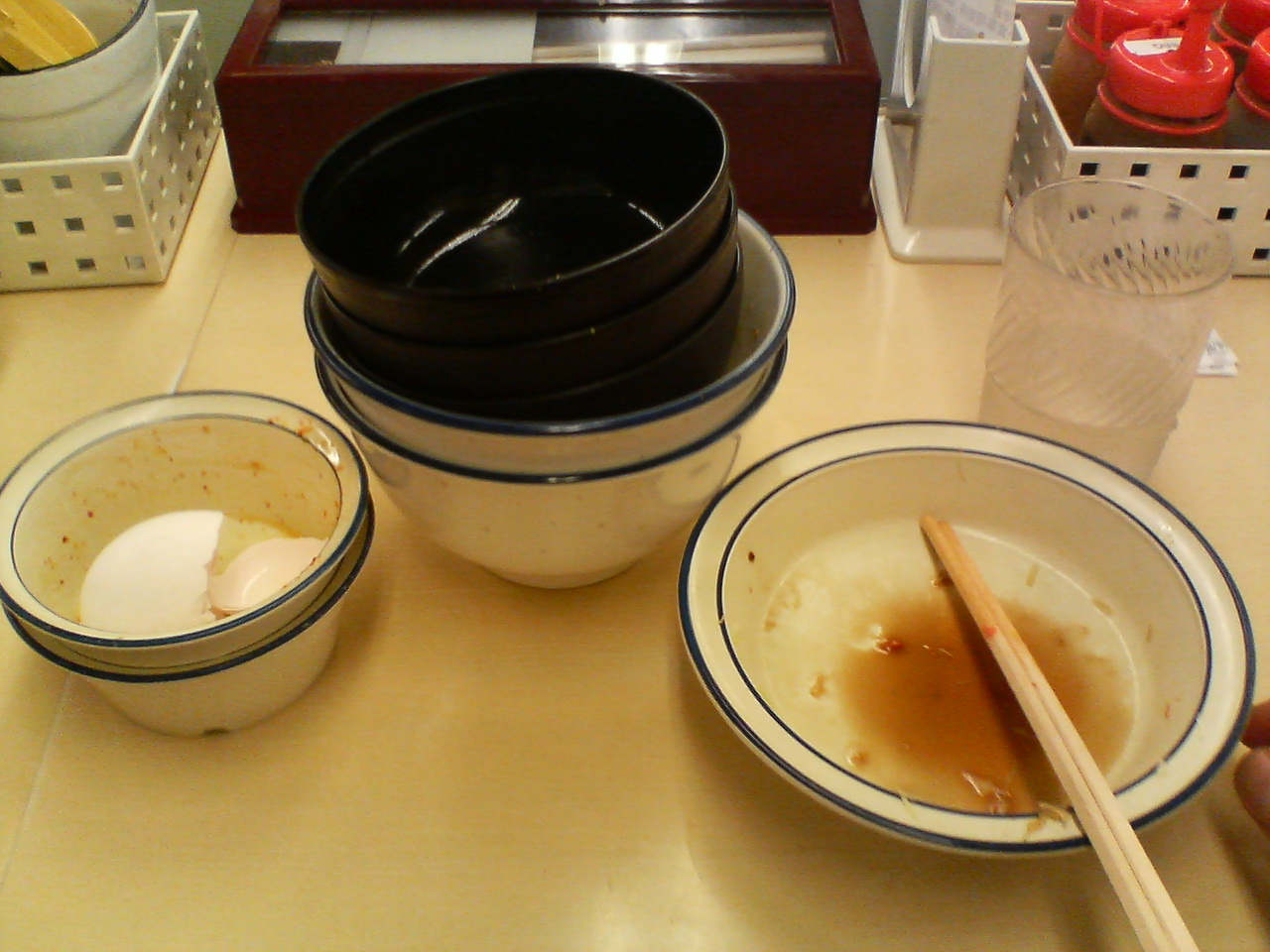 名古屋の居酒屋で発見した最新型エフェクター。 「呼」というサウンドが得られる。 裏側はお約束の006P9V いわゆる「角電」である。 用もなく押すことにより店員に不快感を与えることが出来る魔法のコンパクツエフェクツである。 お椀と丼の数に注目。 頑張った証、と、自分に言いきかせ大阪に向かう。 今宵は俺様の運転でコースレコードを狙う予定。